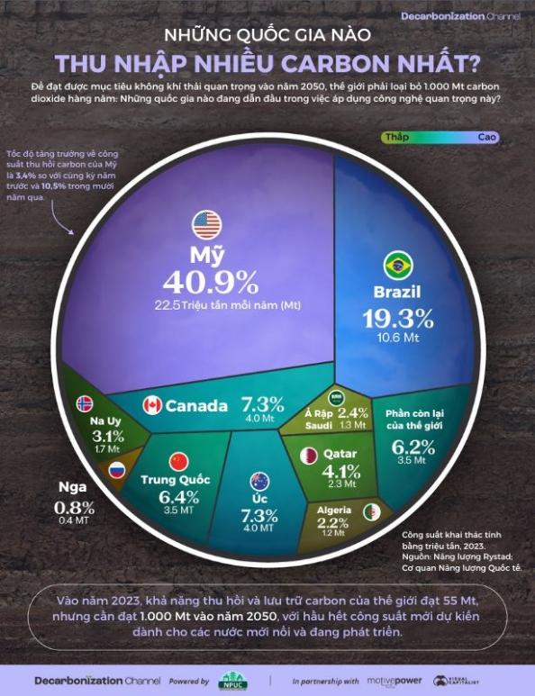 Vào năm 2023, hầu hết năng lực thu giữ, sử dụng và lưu trữ carbon (CCUS) chỉ đến từ hai quốc gia, thu giữ tổng cộng 33 triệu tấn. Tuy nhiên, theo IEA, chúng ta phải loại bỏ 1 tỉ tấn carbon mỗi năm để đạt được mục tiêu không phát thải ròng vào năm 2050.