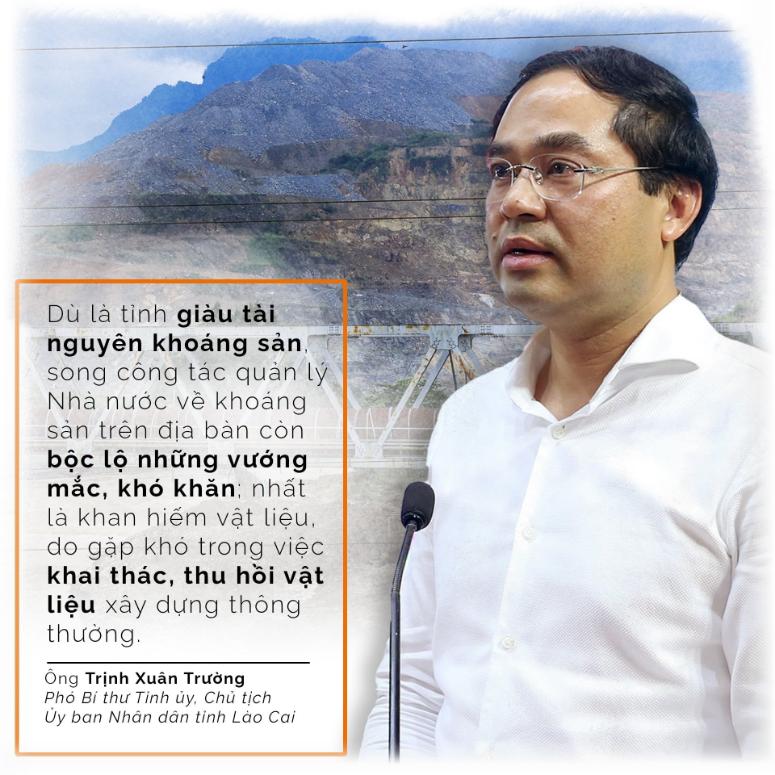 Trả lời câu hỏi của phóng viên Báo Điện tử VietnamPlus, Phó Bí thư Tỉnh ủy, Chủ tịch Ủy ban Nhân dân tỉnh Lào Cai Trịnh Xuân Trường thẳng thắn nêu thực tế mặc dù là tỉnh giàu tài nguyên khoáng sản, song công tác quản lý Nhà nước về khoáng sản trên địa bàn còn bộc lộ những vướng mắc, khó khăn; nhất là khan hiếm vật liệu do gặp khó trong việc khai thác, thu hồi vật liệu xây dựng thông thường.