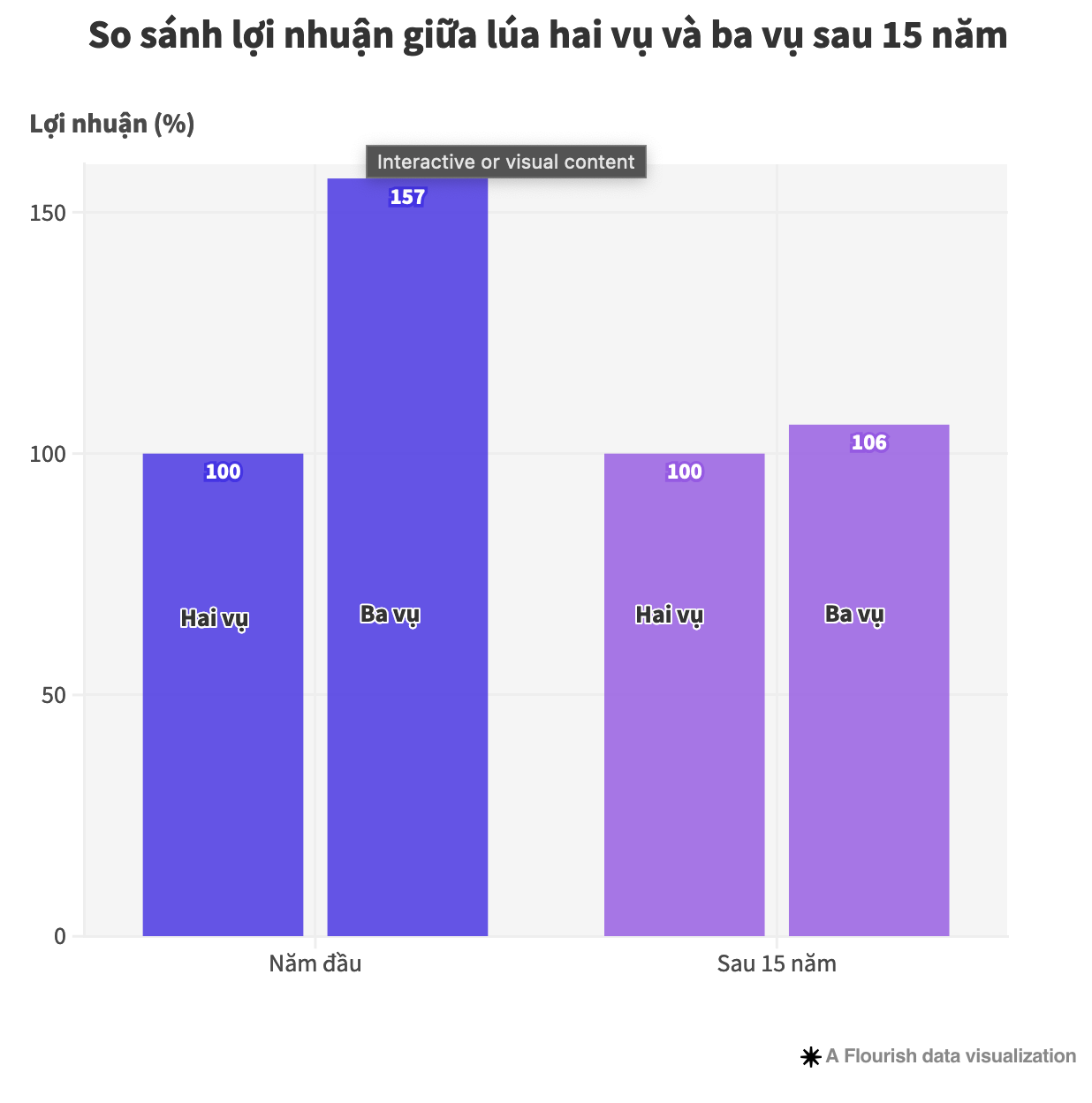 Trên bình diện chung của vùng, nghiên cứu của TS. Trần Đức Dũng (khi đó ở Đại học Wageningen, The Netherlands), đã chỉ ra, ban đầu đúng là canh tác lúa ba vụ thu lợi cao hơn 57% so với canh tác lúa hai vụ, nhưng sau 15 năm, những người nông dân trồng lúa ba vụ chỉ kiếm được nhiều hơn 6% so với những người trồng lúa hai vụ trong khi lao động quanh năm cực khổ hơn rất nhiều. Chi phí sản xuất cao hơn chủ yếu là do tăng sử dụng phân bón và thuốc trừ sâu để bù vào lượng dinh dưỡng trong đất đã bị suy kiệt, hệ sinh thái trong đất không có một ngày nghỉ nào cũng như mất đi nguồn nước lũ để diệt mầm bệnh trong đất.